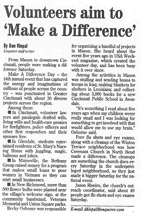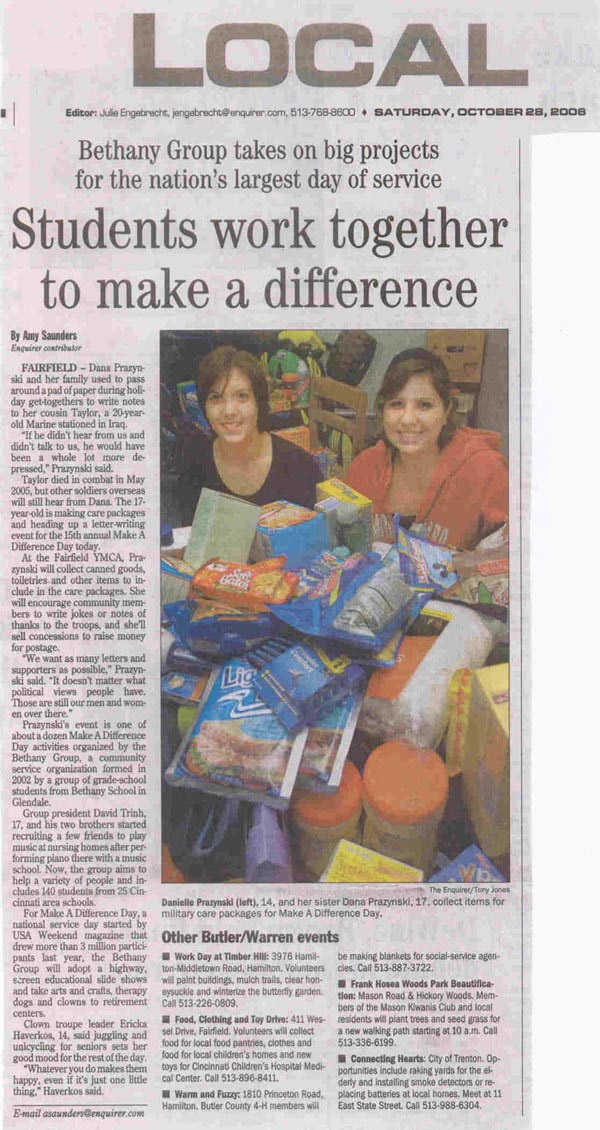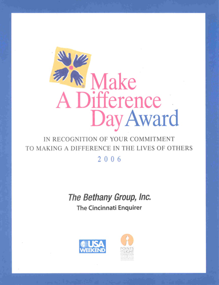 Due to its outstanding participation, The Bethany Group was chosen to be the Regional Honoree for the Greater Cincinnati area by the USA Weekend magazine (which organizes the annual Make A Difference Day) and the Cincinnati Enquirer (local participant):