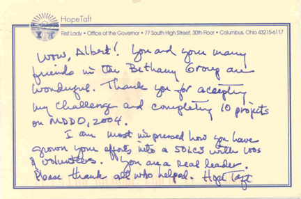 NATIONAL MAKE A DIFFERENCE DAY 2004 On the 2004 National Make A Diffrence Day The Bethany Group organized 11 separate events: 1. Music recital at Blue Ash Nursing Home 2. Music recital at the Waterford of Fairfield Retirement Home 3. Arts & crafts session at the Meadowbrook Care Center 4. Maintenance and clean up session at the Bethany House 5. Adopt-a-Highway maintenane 6. Origami and Tea show at St. Mary’s Memorial Home 7. Healing Touch session at the Meadowbrook Care Center 8. Therapy Dog sessions at Mason Christian Village and Clermont Nursing Home 9. Cincinnati Art Museum slide presentation on “Petra – Lost City of Stone” at the Lodge of Montgomery 10. Save the Children – Economic Opportunities program in Vietnam 11. Volunteer at Bethesda North Hospital. Albert Trinh Below is a note from Mrs. Hope Taft, the First Lady of Ohio congratulating The Bethany Group