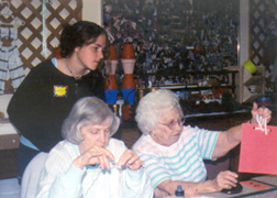 Ericka Haverkos and Emily Jump started an origami program. They not only select the origami foldings that senior hands can still manipulate (at times using soft materials such as napkins instead of paper), but also prepare PowerPoint presentations to illustrate more intricate foldings or colorful end products. The residents always have a great time with these hands-on origami sessions, which are often combined with a tea-drinking ceremony. The digital projector used in this program was purchased with a generous grant from the Procter & Gamble Company; some tea and cookies consumed in these sessions were donated by a Kroger supermarket. In 2007, Tajana Schneiderman took over this program. |